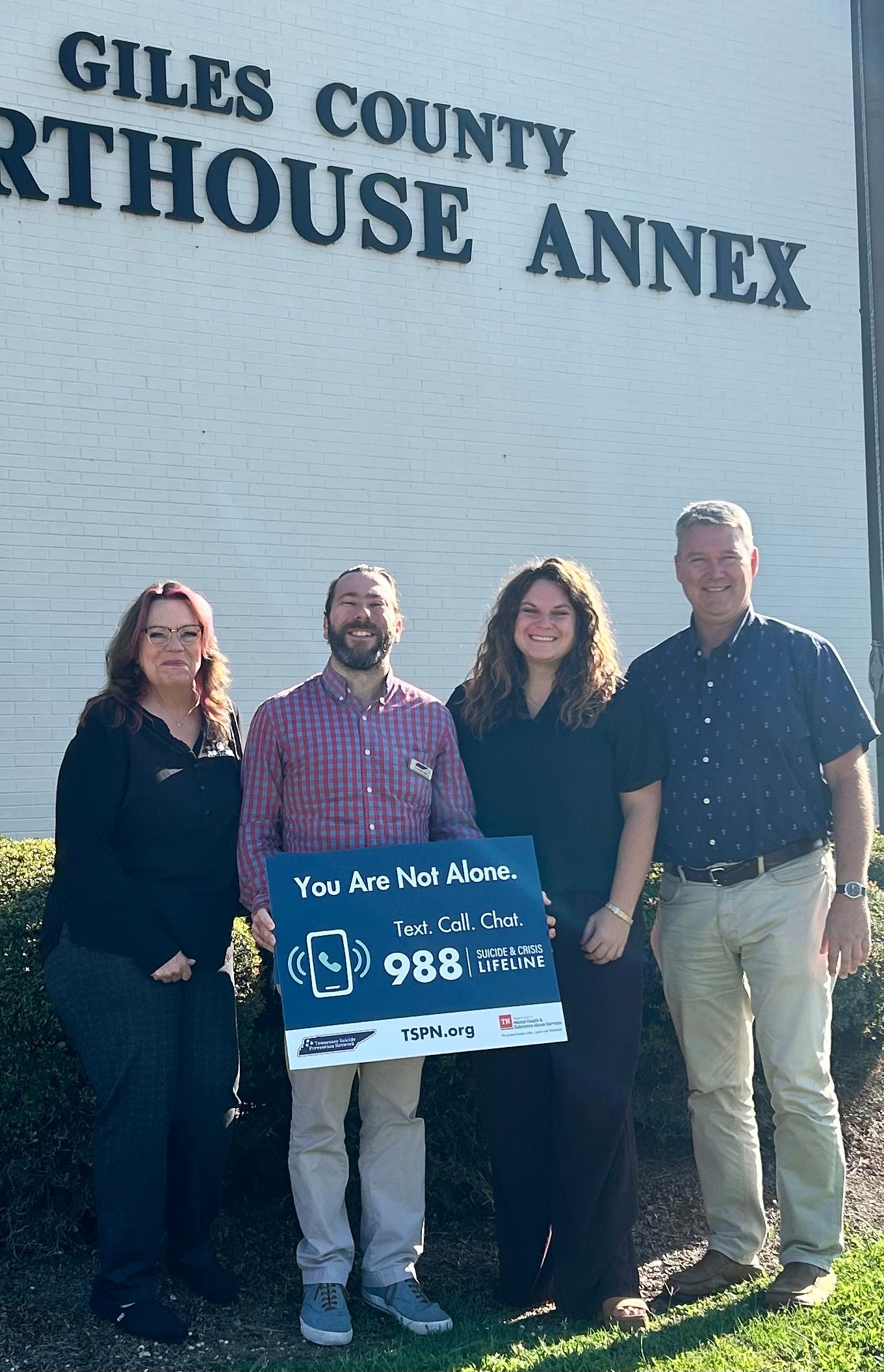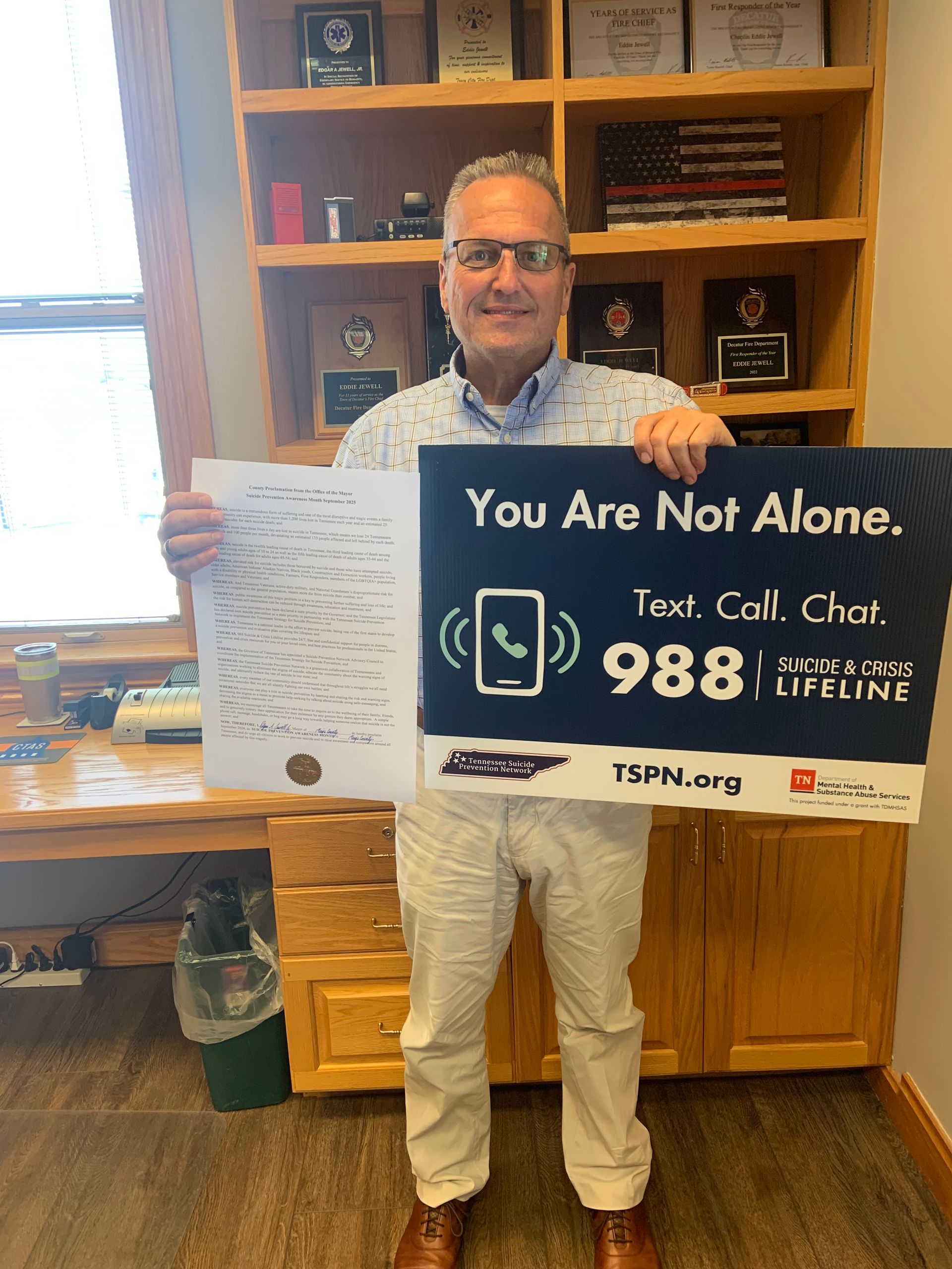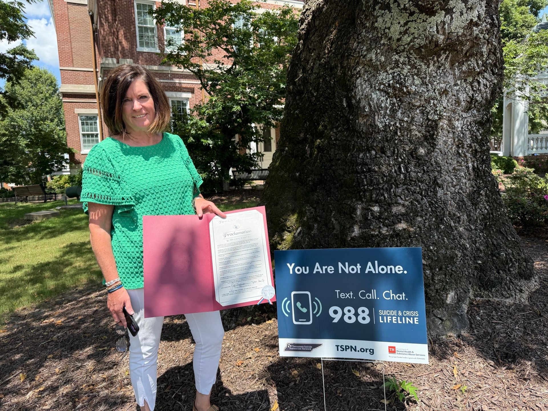 This year's campaign incorporated yard signs provided to each county mayor, promoting their office as a Tennessee Suicide Prevention Partner. The sign will be posted outside their building, advertising both TSPN and the 988 Suicide & Crisis Lifeline. We received great feedback about the 988 signs, which were made available thanks to donor funding. Anyone interested in underwrite the cost of us making more signs available across the state may contact TSPN Executive Director Anna Sever at