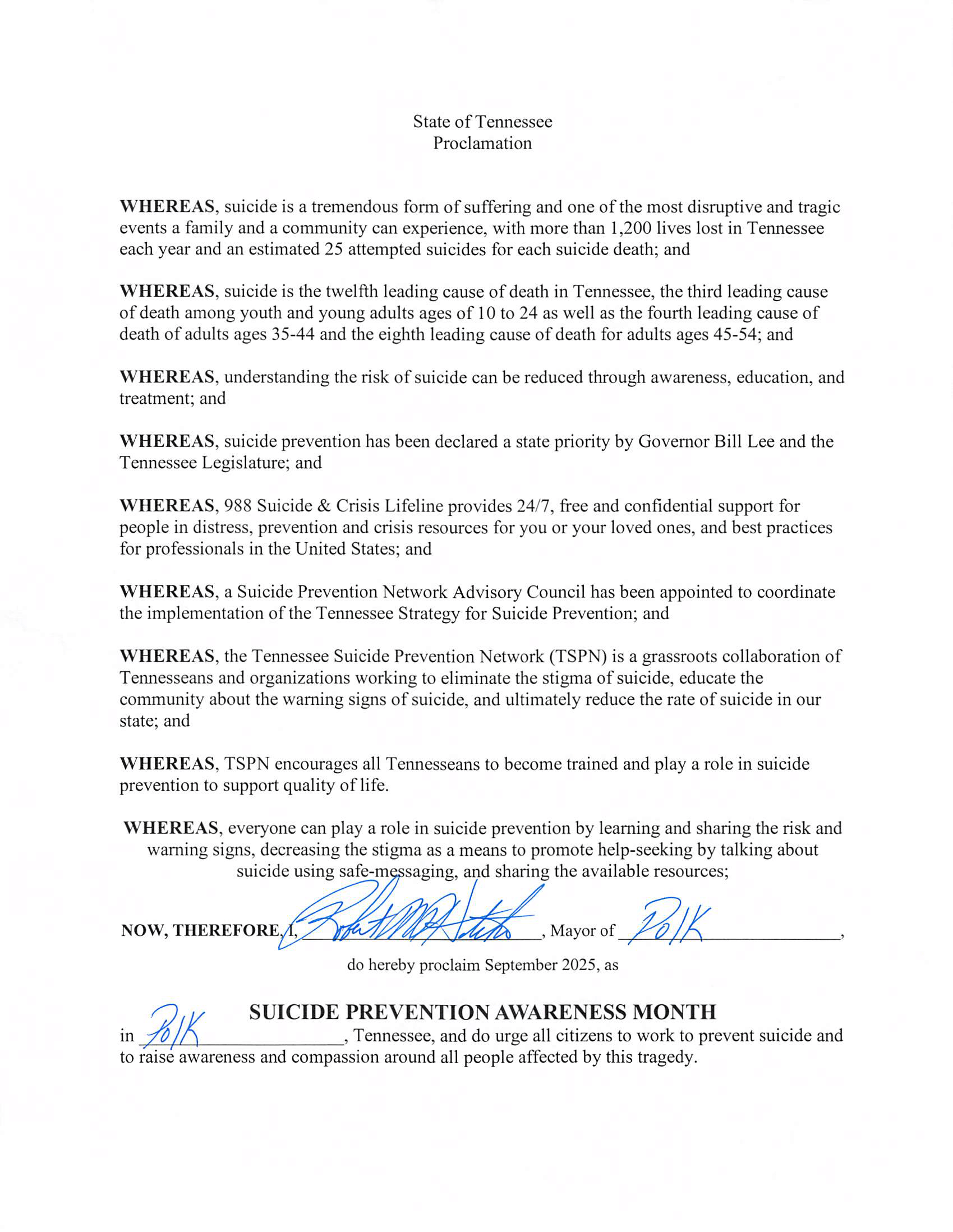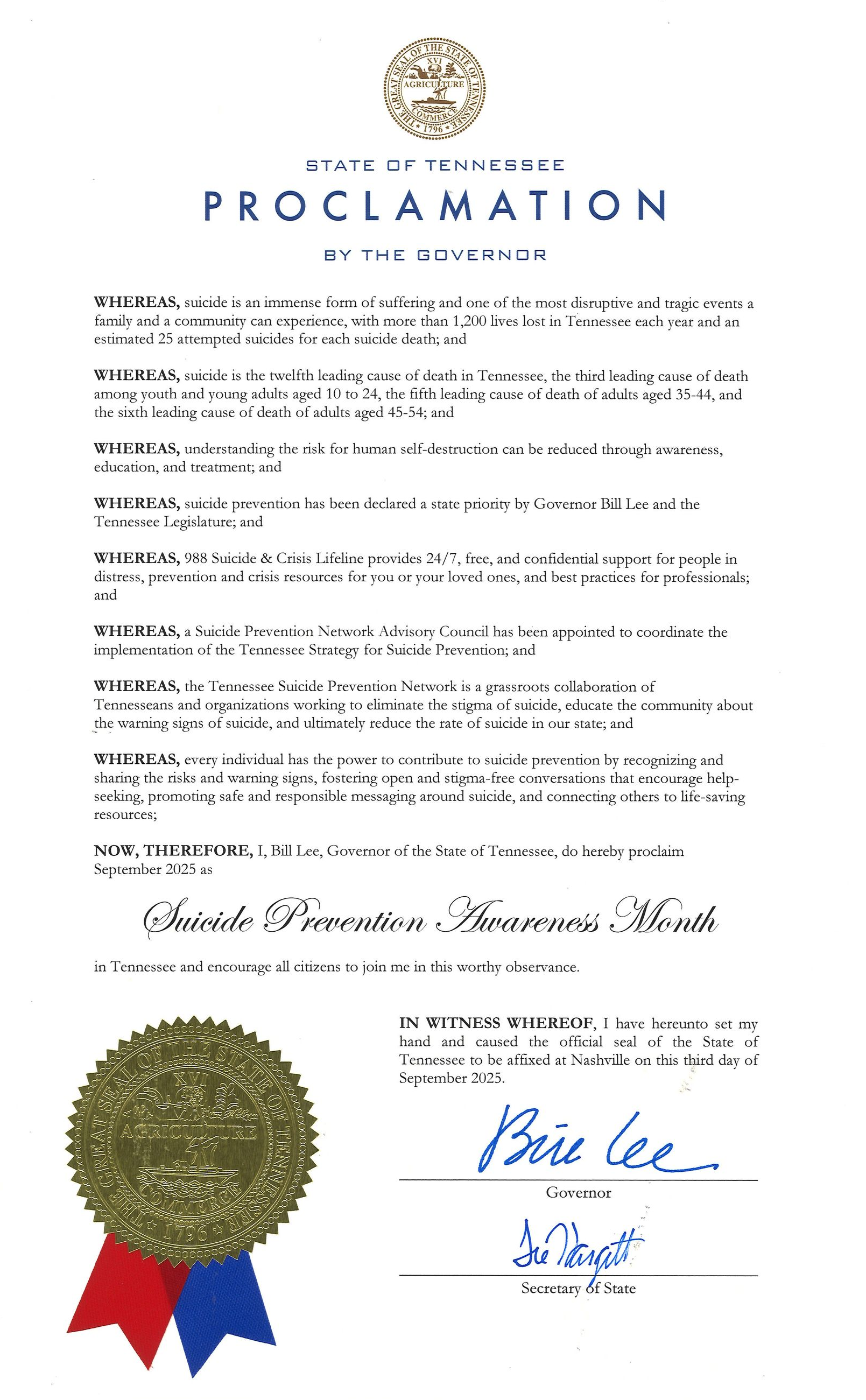 TSPN uses its annual Proclamation Project to elevate community conversations around suicide prevention during its observance of September as Suicide Prevention Awareness Month. By partnering with state and local leaders and advocates, we ensure every corner of Tennessee recognizes and acknowledges the importance of suicide awareness.